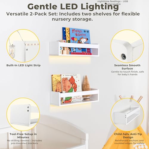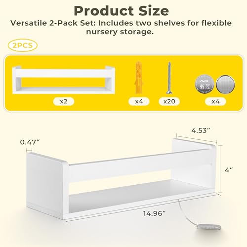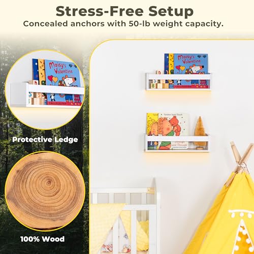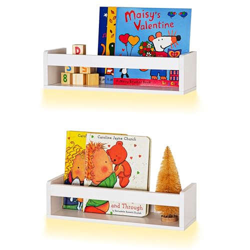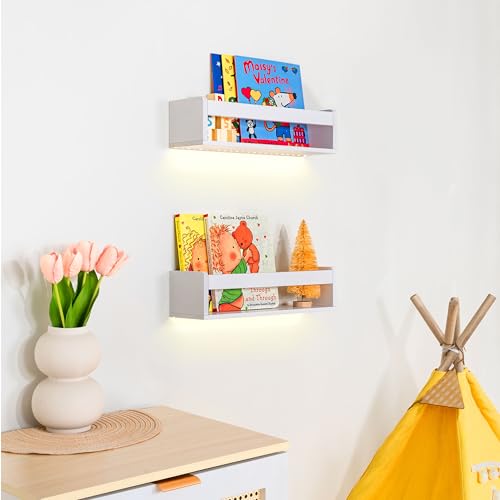 PIERRI - رفوف كتب لغرفة الأطفال - رفوف حائط خشبية مع إضاءة ليد للكتب والديكور والتخزين، رف كتب لغرفة الأطفال وغرفة المعيشة والمساحات الصغيرة، رف تخزين معلق يثبت على الحائط من بيري - (عبوة من قطعتين)