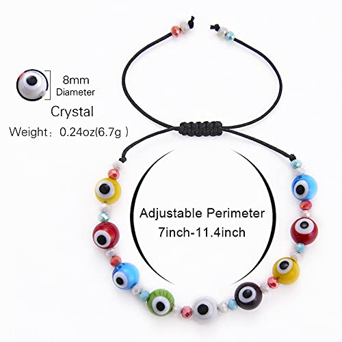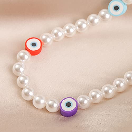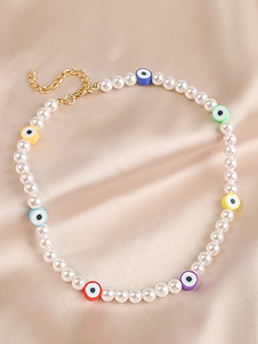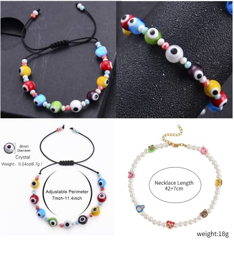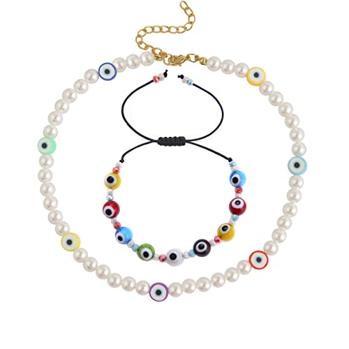 Generic - طقم عقد وسوار من بينغ يونغ تشانغ ملون بخرز عين الحسود ولؤلؤ دائري التصميم للفتيات والنساء سلسلة قابلة للتعديل جلد اصلي مجوهرات صناعة يدوية لؤلؤ وراتنج ومعدن خليط معدني متعدد الألوان بينج يونج شانج
