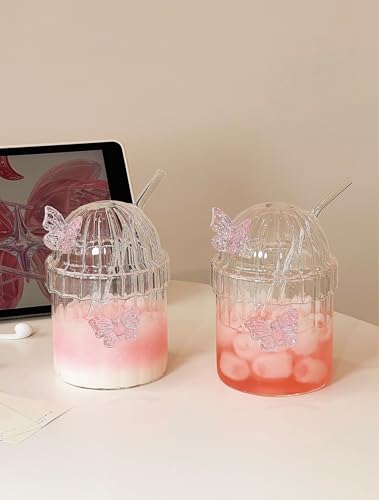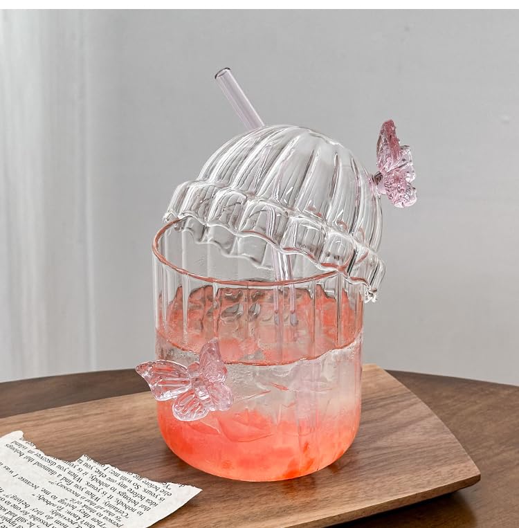 gugululu - كوب زجاجي مزين بفراشة وردية ثلاثية الأبعاد مع غطاء وشفاطة، أكواب شرب مزخرفة لطيفة على الطراز الفرنسي للمشروبات الساخنة والباردة والعصير والكوكتيل واللبن