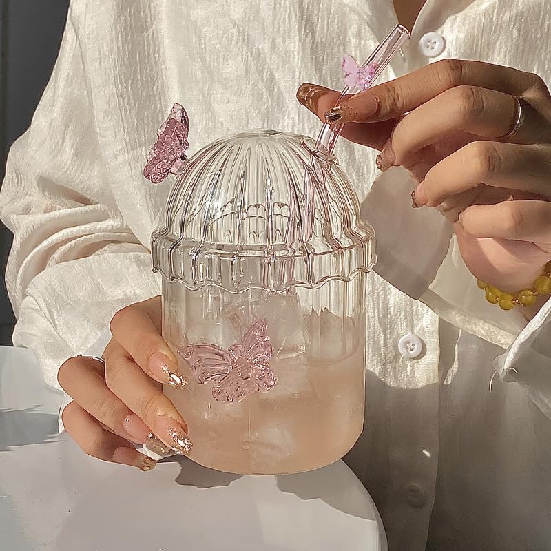 - 【لمسات فراشة ثلاثية الأبعاد غريبة الأطوار】مزينة بفراشات وردية منحوتة بدقة على كل من جسم الكوب والغطاء المقبب، كل قطعة تشع بسحر مرح من القصص الخيالية. شكل ناعم ومستدير يمنحك شعورًا بالسعادة في اليد، بينما تضيف الخطوط الرأسية الدقيقة ملمسًا وعمقًا دقيقًا إلى الزجاج الشفاف للغاية
