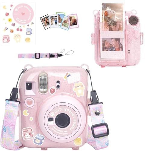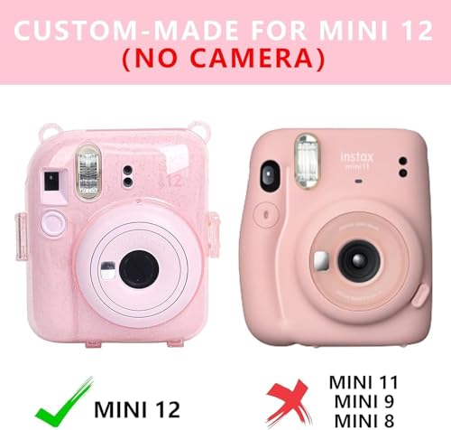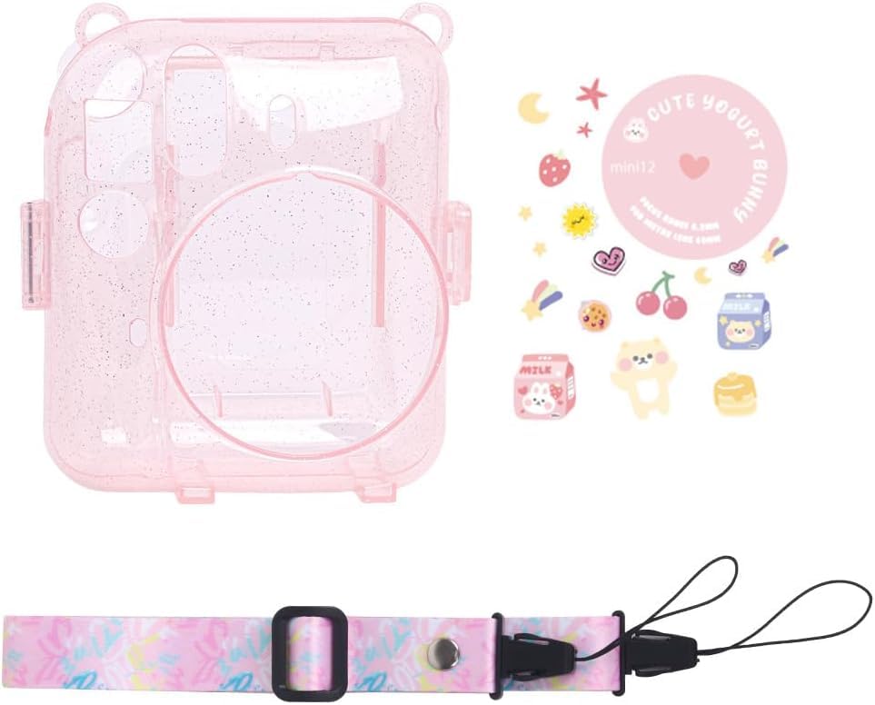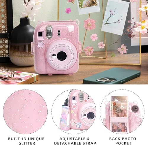 GQ - حافظة بينك لكاميرا فوجي فيلم انستاكس ميني 12 (غطاء حقيبة من الجلد الصناعي) مع حزام كتف مطور حديثًا قابل للتعديل وملصقات بنمط جميل وألبوم صور صغير 64 جيبًا (بينك زاهي)
