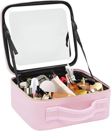 Generic - شنطة سفر لمستحضرات التجميل بلون زهري - حافظة مراة باضاءة LED مع مساحة تخزين متعددة الاقسام، خفيفة الوزن ومتينة للاستخدام اليومي والرحلات الطويلة