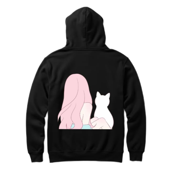 Generic - Pink Hair Girl White Cat Hoodie back أسود