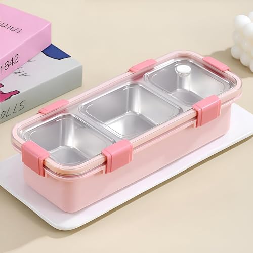 Generic - لانش بوكس بينك - صندوق غداء من الستانلس ستيل مانع للتسرب مع 3 مساحات تخزين باللون الزهري، مثالي للوجبات الخفيفة والوجبات، متين وسهل التنظيف، يحافظ على حصص الطعام طازجة ومنظمة للمدرسة أو العمل أو السفر