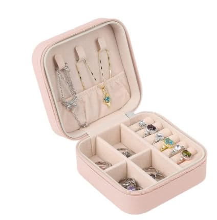Generic - صندوق مجوهرات صغير منظم للخواتم والحلقان والسلاسل والأساور حافظة مجوهرات صغيرة محمولة للسفر للبنات حافظة عرض المجوهرات بلون وردي