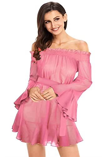 Generic - بلوزة بينك نسائى شيفون باكمام واسعة وحزام وسط