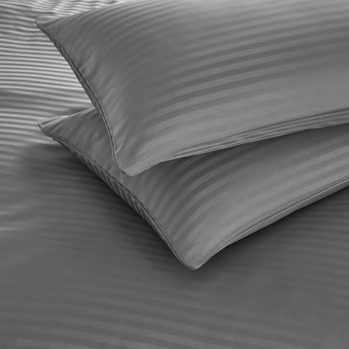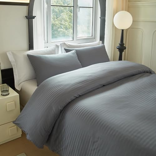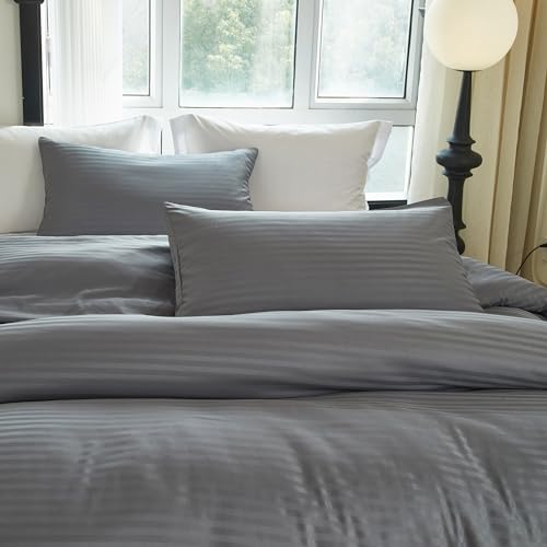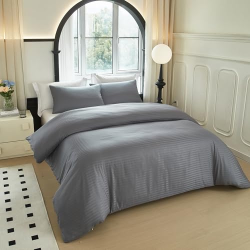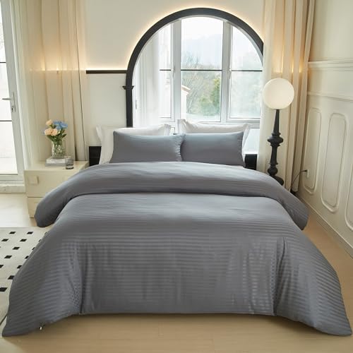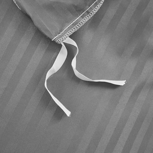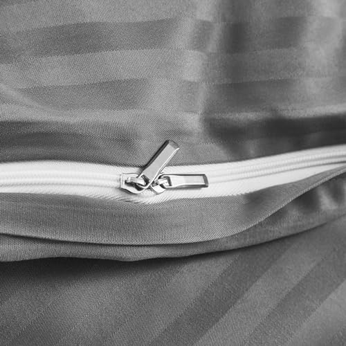 PinkMemory - بينك ميموري طقم غطاء لحاف مخطط من الساتان بلون رمادي مقاس كينغ الحريري المصقول والمايكروفايبر - اغلاق بسحاب ناعم - بدون حشوة الألياف الدقيقة مُخطط