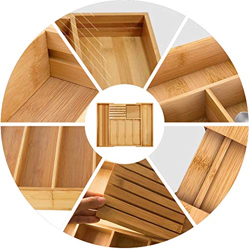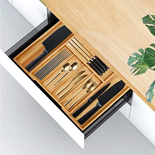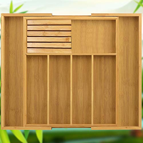 Pinshion - منظم دولاب المطبخ من الخيزران نقي، لتنظيم وتقسيم الأدراج في المطبخ، صينية أدوات مائدة وملاعق رائعة قابلة للتوسيع وقابلة للتعديل من بينشيون