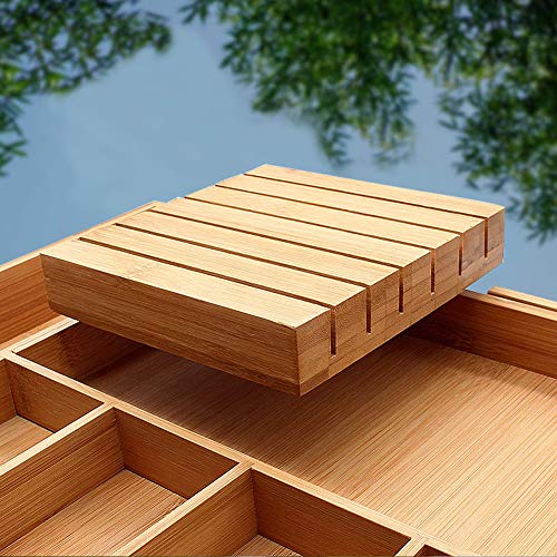- 【تناسب أي مكان】صينية أدوات المائدة مزودة بفواصل مجرّدة بين الأدراج، مصممة لاستيعاب أقصى سعة وسهولة استخدام فائقة. حامل سكاكين قابل للإزالة لوضع السكاكين. يسهل العثور علي أدوات مطبخك في كل مرة تحتاج إليها