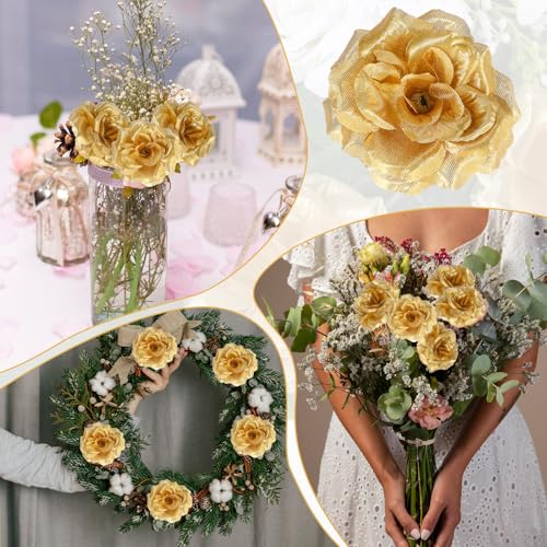 - مثالية للأعمال اليدوية: تتميز هذه الورود الذهبية بلونها الزاهي وسهولة تنسيقها مع مختلف الحرف، مما يتيح تصميم ديكورات مخصصة بكل سهولة. مثل الملابس ودبابيس الشعر وأدوات الزينة للألبومات والبطاقات واكسسوارات القبعات ومشاريع الحرف اليدوية.