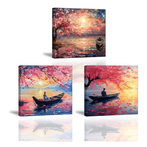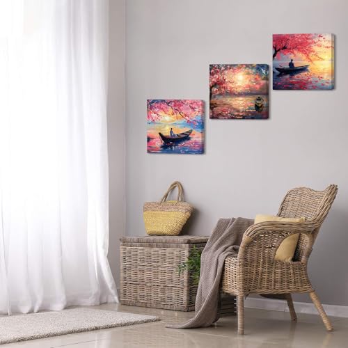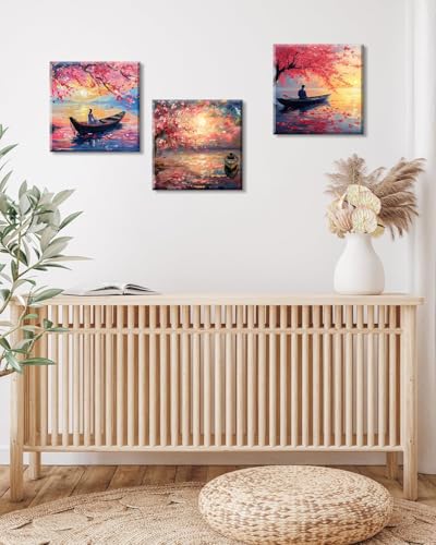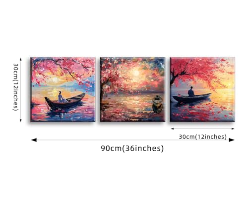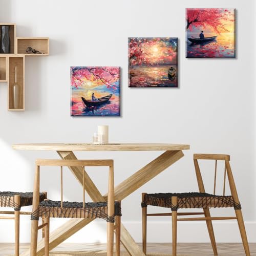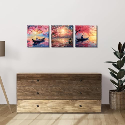 Piy Painting - باي باينتينغ لوحة قماشية بتصميم منظر غروب الشمس على قوارب صغيرة، لوحة زخرفية على قماش مع زهور وردية، طباعة قماشية لغرفة النوم وغرفة المعيشة والمكتب، 3 قطع 30 × 30 سم