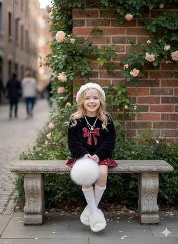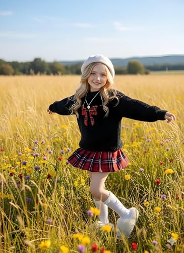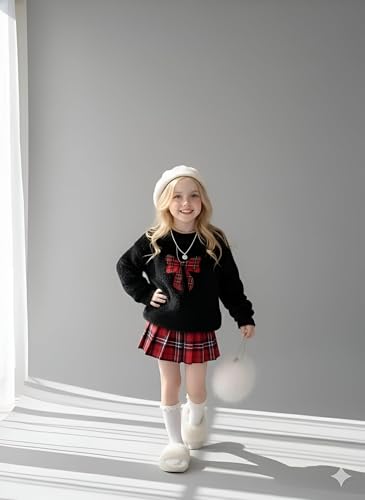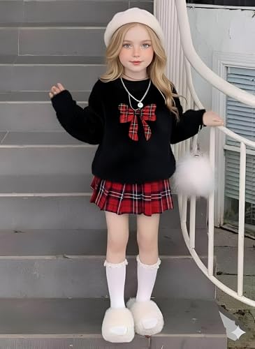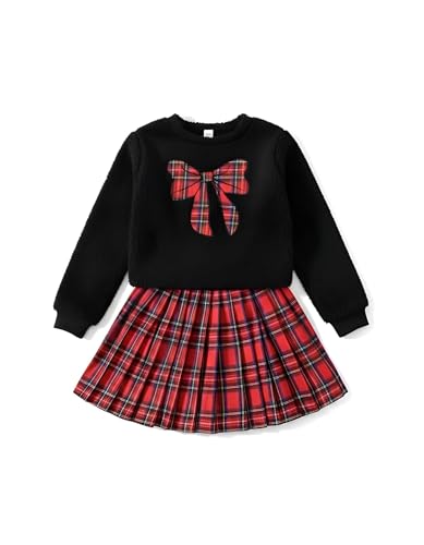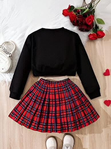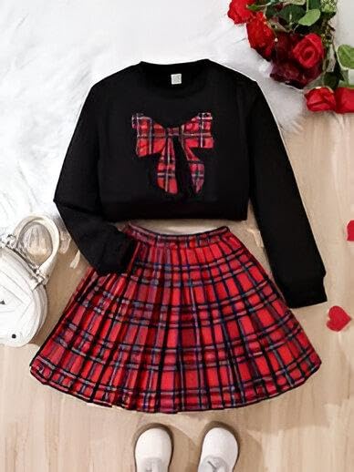 Generic - كاروهات باريد - مظهر من قطعتين مع سويت شيرت اسود منفوش وفيونكة منقوشة حمراء جريئة مع تنورة حمراء منقوشة بكسر، اكمام طويلة لاطلالات يومية متعددة الاستخدامات