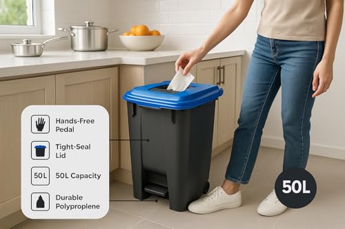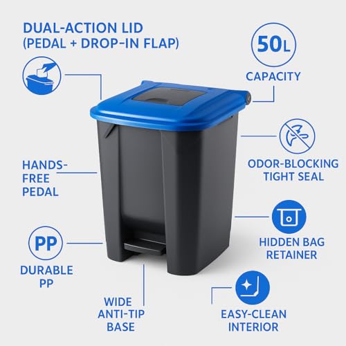 Generic - سلة قمامة بلانيت مع دواسة وغطاء مربع صغير في الأعلى للاستخدام الصحي، مزودة بعجلات وجردل داخلي للمتانة، تستخدم في المدارس والمستشفيات والجامعات ومراكز التسوق، 50 لتر (لون أزرق)