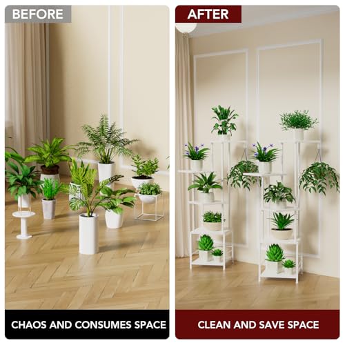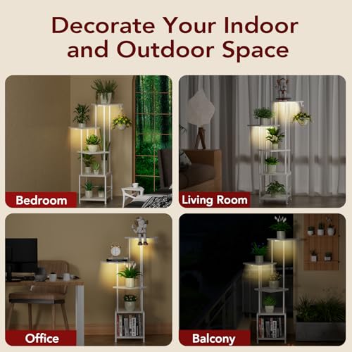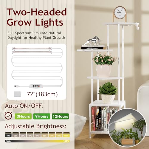 Homsorout - حامل نباتات داخلي مع ضوء للنمو، حامل نباتات طويل من 5 طبقات داخلي، رف نباتات معدني مع خطاف سلة معلق وضوء قابل للتعديل، مثالي لغرفة المعيشة والحديقة (2 فناء ابيض)