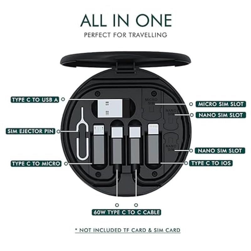 Generic - مجموعة كابل بيانات للسفر والشحن السريع من البلاستيك الكل في 1 تحتوي على منفذ لايتنينج ومايكرو USB وحامل موبايل مدمج متوافق مع جميع أنواع الموبايلات - أسود، لهاتف خلوي