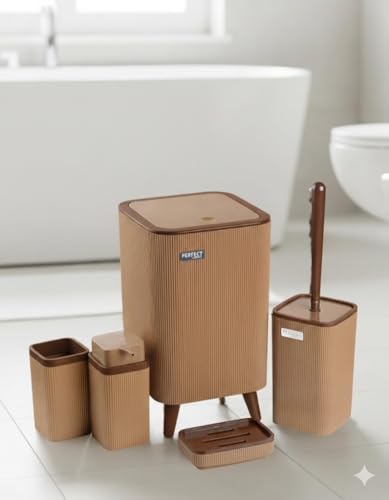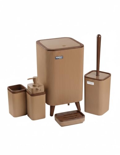 Generic - طقم إكسسوارات الحمام البلاستيكية، 5 قطع، موزع صابون، صبانة، سلة مهملات، فرشاة مرحاض مع حامل، حامل فرشاة أسنان، لون بني، 35×15×14 سم