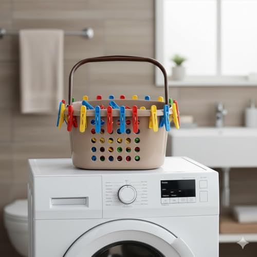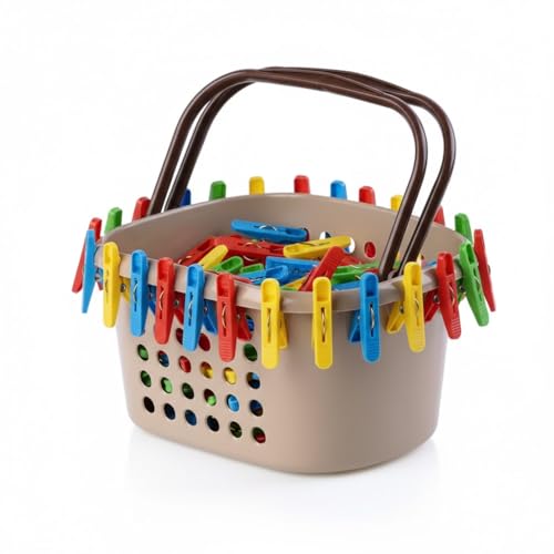 - تصميم عملي وأنيق: سلة غسيل بلاستيكية بلون بيج مع مقبض بني متين، تجمع بين الأناقة والعملية لتنظيم مشابك الغسيل في مكان واحد