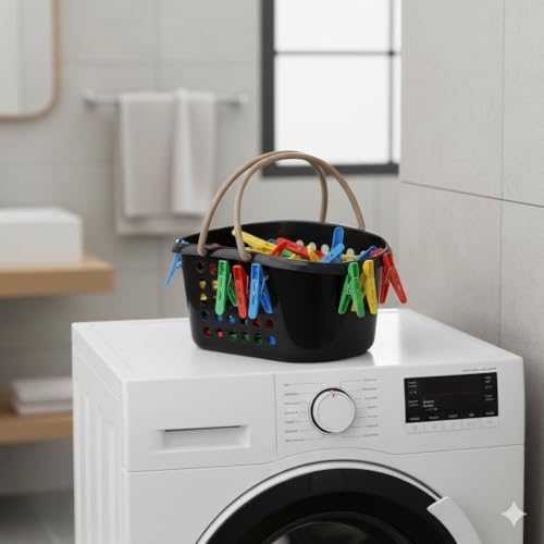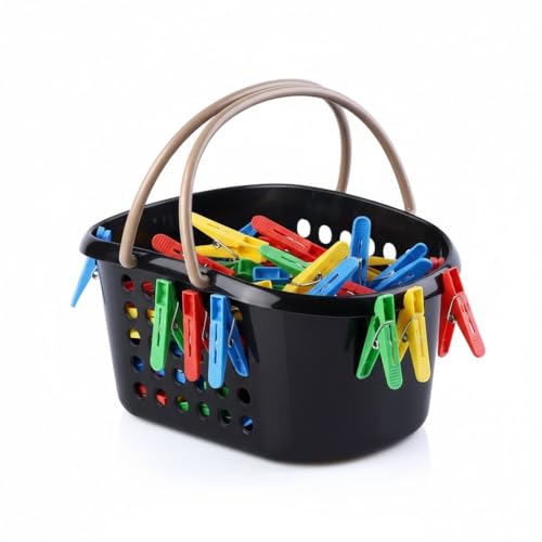 - تصميم عملي وأنيق: سلة مشابك غسيل بلاستيكية بتصميم عصري باللون الأسود مع مقابض حمل مريحة، مثالية لتنظيم وتخزين مشابك الغسيل بشكل منظم وأنيق