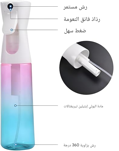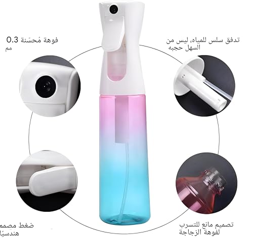 - استمتع برذاذ مستمر فائق الدقة من فوهة 0.3 ملم توفر رذاذًا سلسًا ومتساويًا. الضغط الخفيف ينتج رذاذًا مستمرًا لمدة 2 إلى 3 ثوانٍ، بينما يتيح لك التصميم بزاوية 360 درجة الوصول إلى كل زاوية وزاوية، مما يجعله مثاليًا للتصفيف الدقيق ورش العناية بالبشرة ولمسات المكياج والمهام اليومية دون قطرات أو هدر.