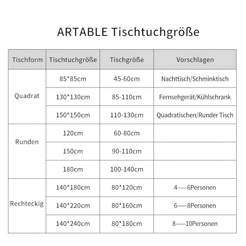 - يتوفر هذا المفرش بأحجام متنوعة بما في ذلك 140 × 180 سم، و140 × 220 سم، و140 × 240 سم، ويمكنه أن يتناسب مع أبعاد مختلفة للطاولات. شكله المستطيل يجعله متعدد الاستخدامات لإعدادات الطاولات المختلفة، مما يضمن ملاءمة مثالية لمنطقة تناول الطعام الخاصة بك.