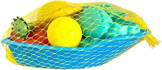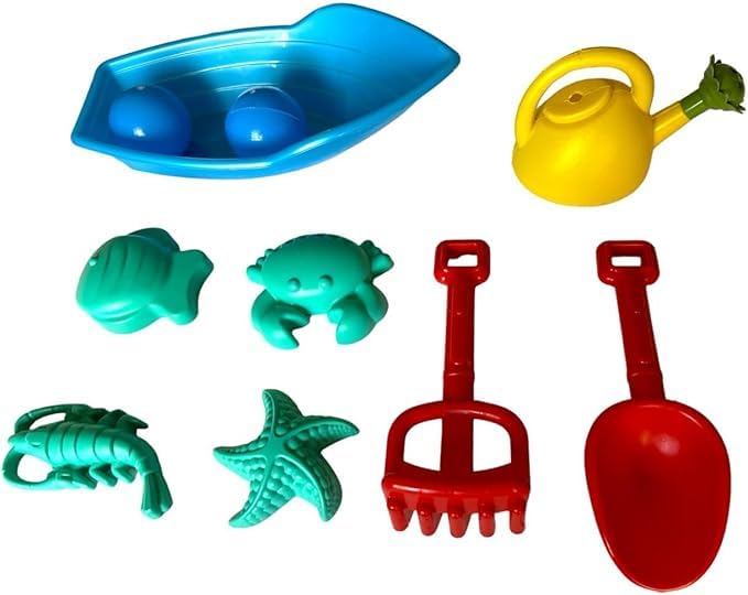 - مجموعة لعب مكونة من 1 دلو بحر (على شكل قارب) مع كرتين و2 أداة تشكيل الرمل و4 ألعاب بحرية و1 رشاش مياه وشنطة شبكية.