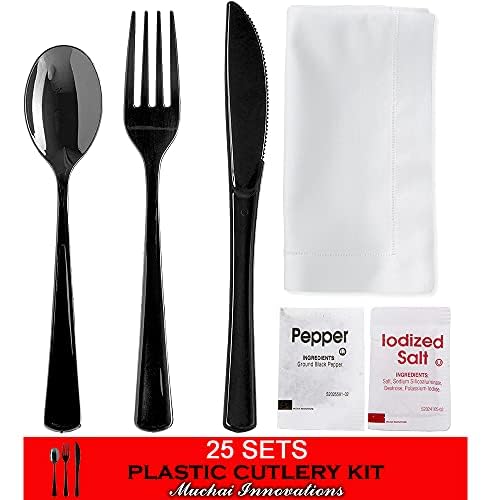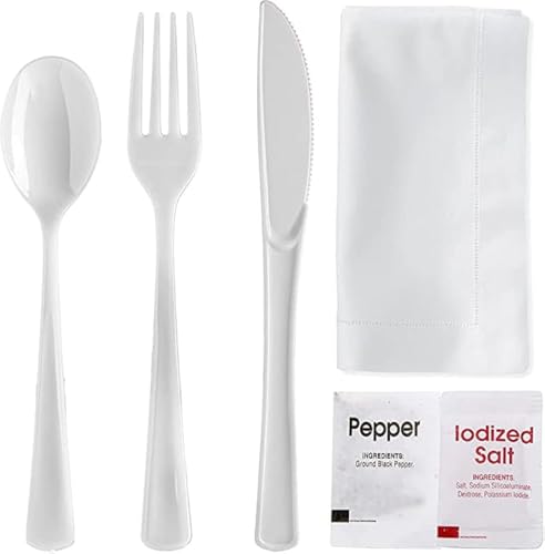 Muchai Innovations - طقم أدوات مائدة شديد التحمل من البلاستيك، سكاكين وشوك وملاعق ومناديل وملح وفلفل للاستعمال مرة واحدة مغلفة بشكل فردي للحفلات وأعياد الميلاد والنزهات والسفر والتخييم بلون أبيض من 50 قطعة