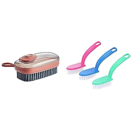 Generic - فرشاة بلاستيك للتنظيف مع موزع للصابون بلون رمادي وسيمون + فرش تنظيف متعددة الاغراض - عبوة من 3 قطع