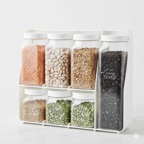 - مجموعة متكاملة: طقم من 7 برطمانات بلاستيكية بأحجام مختلفة (3 برطمانات 400 مل، 3 برطمانات 700 مل، 1 برطمان 1300 مل) مع حامل تنظيمي لتوفير المساحة