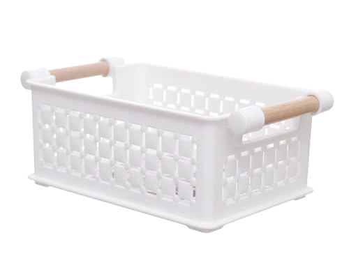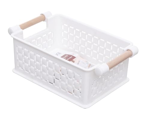 Generic - منظم تخزين بلاستيك بمقبض خشب مقاس 13 × 17 × 8 سم - ابيض و بيج