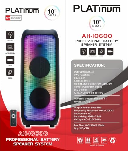 Generic - سماعة بلاتينيوم AH-10600 بلوتوث بعجلات قدرة 80 وات،مكبرات مزدوجة 10 بوصة، تحكم X-Bass، إضاءة ديسكو LED، USBكارت SD/FM/AUX/بلوتوث/TWS، ميكروفون + ريموت، بطارية قابلة للشحن – نظام صوت احترافي للحفلات