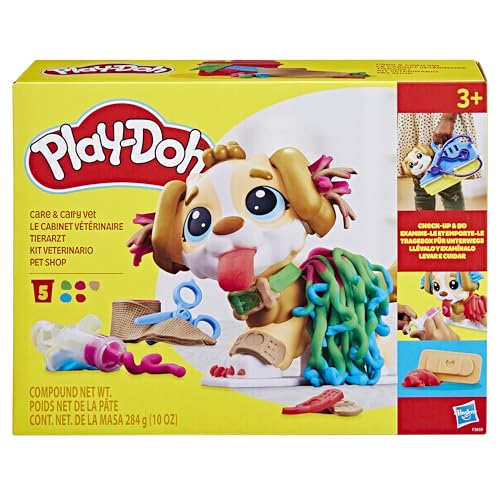 Hasbro - مجموعة ألعاب عيادة بيطرية كير اند كاري للأطفال بعمر 3 سنوات فما فوق مع لعبة كلب ومخزن و10 أدوات و5 ألوان مركبات لقوالب التشكيل غير سامة من بلاي-دو