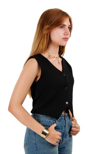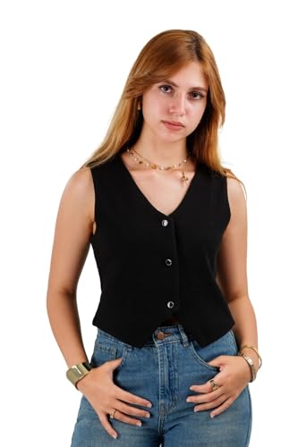 Generic - فيست أسود للنساء من بلين دي في - بلوزة كلاسيكية بدون أكمام قابلة للتمدد، قطن 100% مع ليكرا، كاجوال