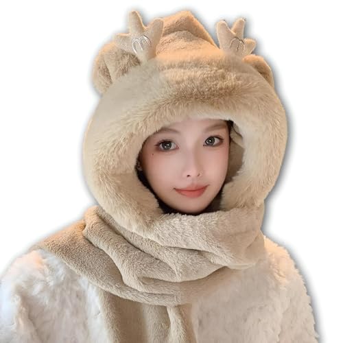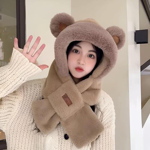 Generic - وشاح مخملي بغطاء راس على شكل اذن دب - قبعة دافئة من الفرو الصناعي الناعم الابيض مع كرات بوم بوم بوم بتصميم حيوان لطيف للارتداء المريح في الطقس البارد