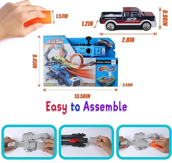- ٤) الأبعاد المثالية: المضمار بطول ٣٤.٥ سم وعرض ٩ سم، وسيارة الشرطة بطول ٧.١ سم، مما يجعله مناسباً للعب المنزلي