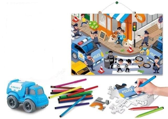 - محتويات المجموعة: بازل تعليمي للأطفال مع سيارة شرطة زرقاء وأقلام تلوين ملونة