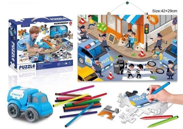 Generic - لعبة بازل شرطة للأطفال، 42×29 سم، مع سيارة شرطة زرقاء وأقلام تلوين، بازل للأطفال مع رسومات مدينة الشرطة