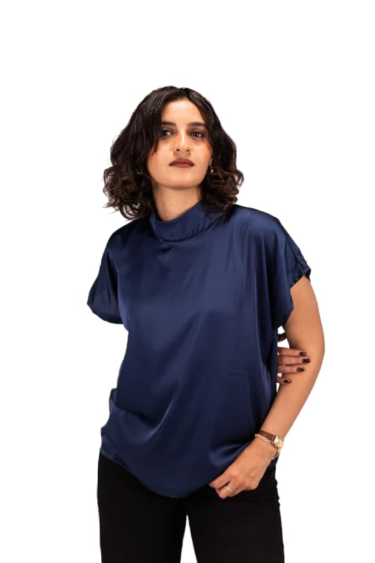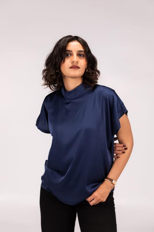 Pomme - بلوزة أساسية من الساتان بياقة وهمية وأكمام واسعة من بوم، US-102- أزرق غامق