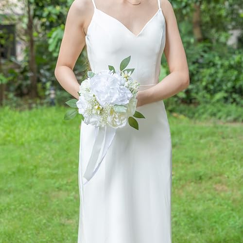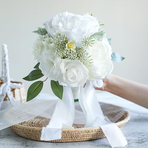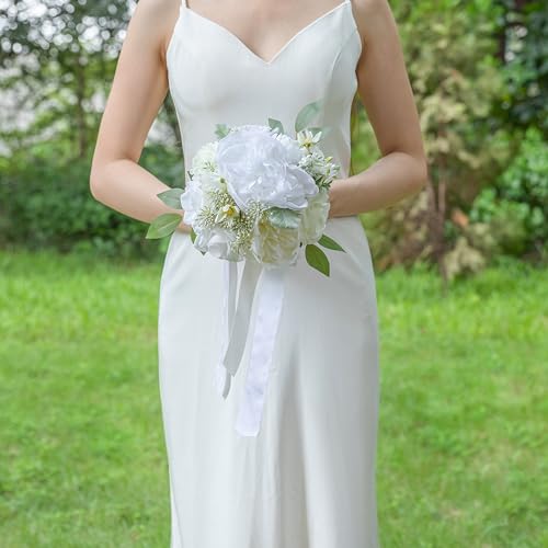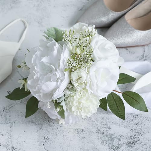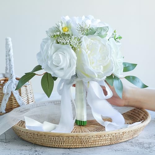 - 【 محتويات باقة زهور الزفاف】: تحتوي باقة زهور الزفاف البيضاء هذه على ورد مصنوع من الحرير والفوم وأوراق الأوكالبتوس الخضراء ذات اللمسة الثلجية وشريط من الشيفون. باقات الزفاف الاصطناعية مصنوعة يدويًا وتتميز بتصميم بسيط وأنيق وألوان زاهية ومريحة، وهي مثالية لتزيين حفل زفافك.