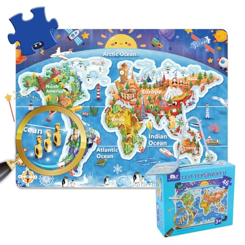 POPSTIKR - احجية ارضية للاطفال من بوبستيكر للاعمار من 4 الى 8 سنوات، احجية ارضيات خريطة العالم، احجية جيغسو للاطفال الصغار، هدايا للاولاد والبنات، تصميم منتفخ (46 قطعة، 24×18 انش)