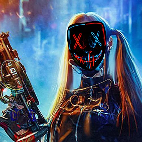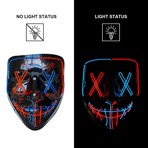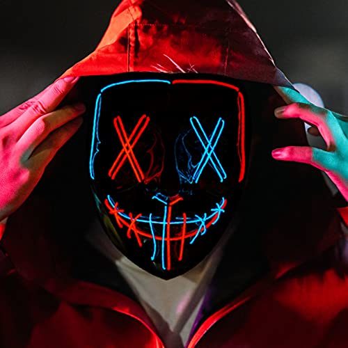 Poptrend - قناع هالوين مخيف بإضاءة ليد للمهرجانات والكرنفالات والهالوين والحفلات التنكرية والهدايا (أحمر + أزرق)