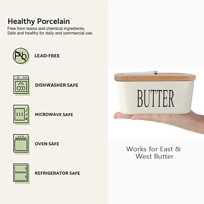- تصميم أنيق: طبق زبدة من البورسلين الأبيض مع غطاء طبيعي يجمع بين الجمال الحديث والعملية لأي طاولة مطبخ