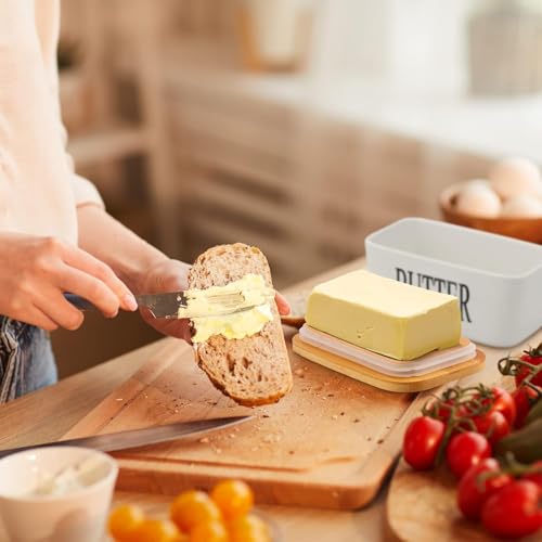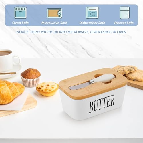 - التصميم: طبق زبدة أنيق من البورسلين الأبيض مع غطاء من البالمبو وحامل سكاكين مدمج، مثالي للتخزين على سطح المطبخ.