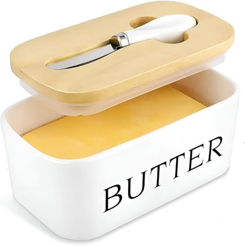 Generic - وعاء حفظ وتقديم الزبدة بورسلين مع غطاء خشب البامبو وسكين ستانلس ستيل - آمن للميكرويف وغسالة الصحون والفريزر