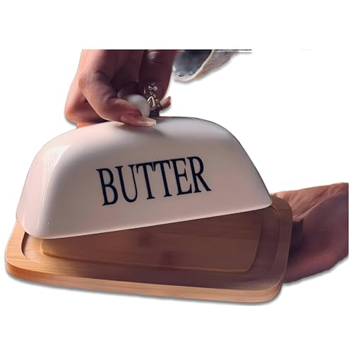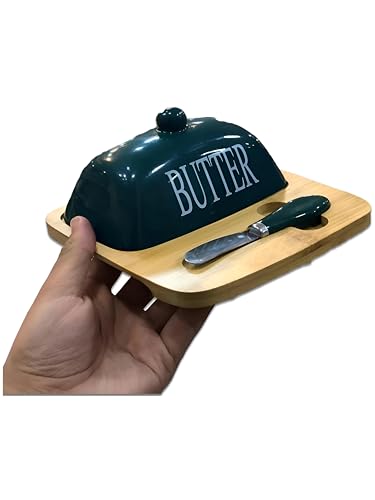 Generic - طاجن زبدة مصنوع من البورسلين مع قاعدة خشب طبيعي بعناية فائقة ❤️ حافظة بورسلين للزبدة مع غطاء خشب بامبو مرفقة بسكين فرد استالس ذو يد بورسلين تناسب الاستخدام في الميكرويف