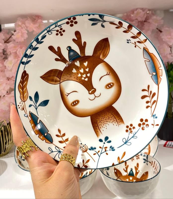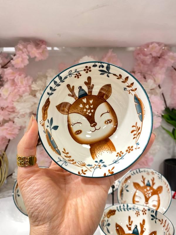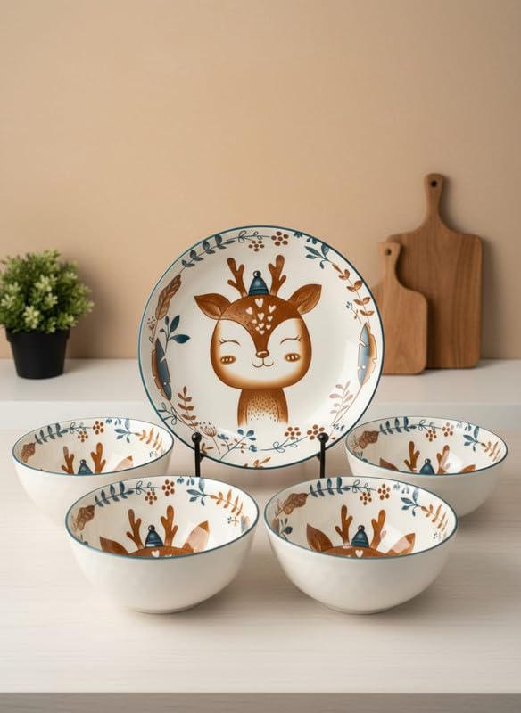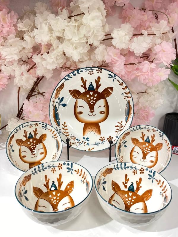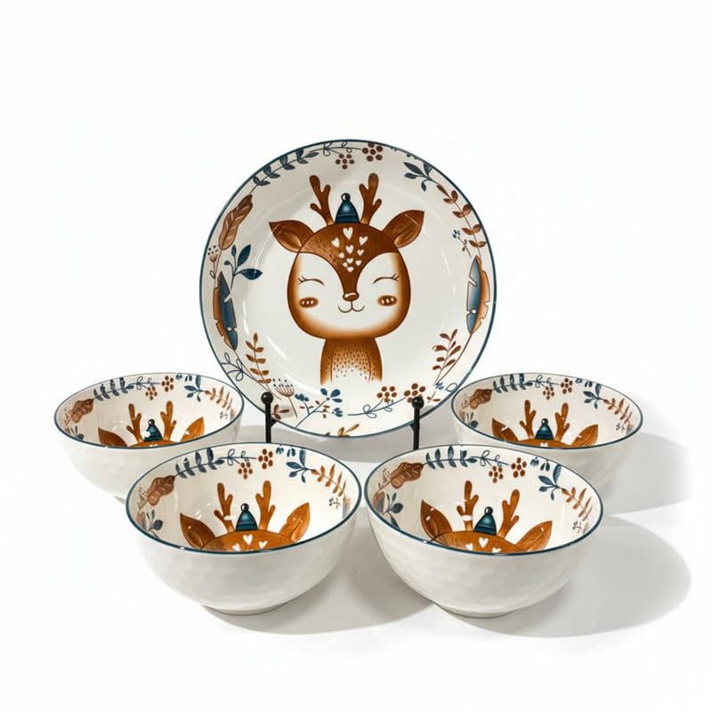 Generic - طقم بولات بورسلين على شكل غزال من 5 قطع من طبق كبير و4 بولات مطابقة، بورسلين مصقول مقاوم للحرارة، تصميم لطيف على شكل حيوان الرنة لوجبات الأطفال والعائلة، متين وسهل التنظيف