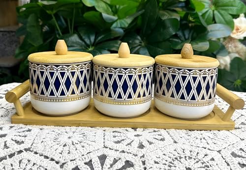 Generic - تخزين طعام بورسلين - 3 برطمانات محكمة الغلق مع اغطية خشبية للشاي والسكر والقهوة، سعة 350 مل، رف خشبي مدمج (الخيار 1)