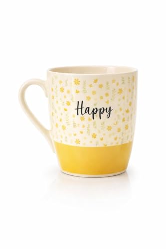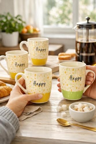 - مجموعة من أربعة أكواب سيراميك مطبوعة بتصميم مرح "Happy"، تتميز بزهور صفراء وخضراء صغيرة على خلفية كريمية.
