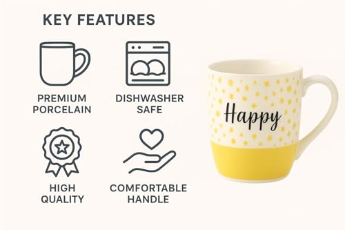 - مصنوعة من البورسلين الفاخر، الأكواب متينة وتحافظ على ألوانها النابضة بالحياة حتى بعد العديد من دورات غسالة الأطباق.