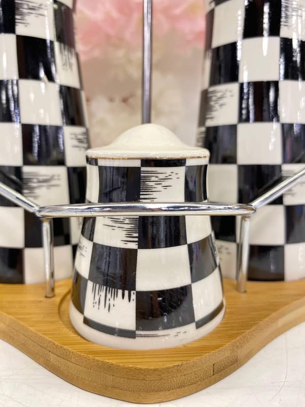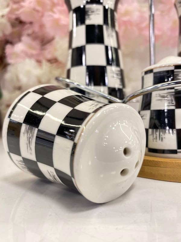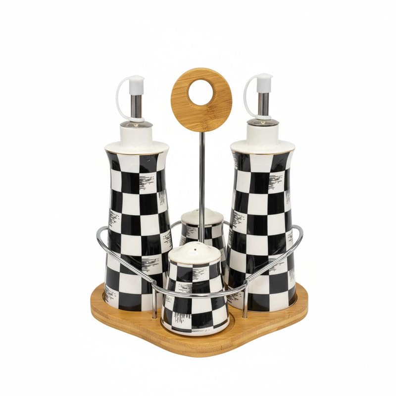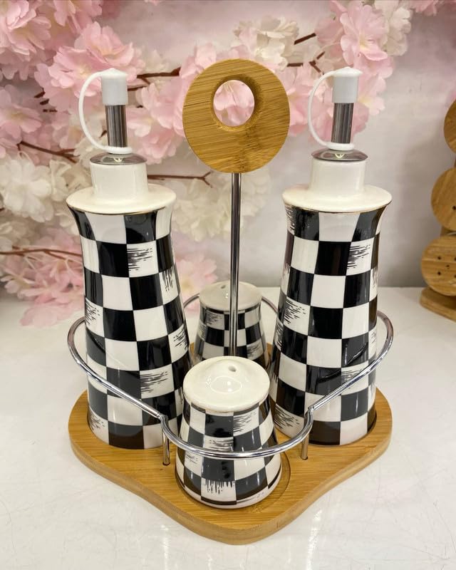 Generic - مجموعة زجاجات توابل وزيت من البورسلين، 4 قطع من زجاجات توابل المطبخ مع حامل من الخيزران، تتضمن موزعين زيت و2 شيكر، تصميم مربعات باللونين الاسود والابيض، متينة وسهلة الاستخدام وعرض انيق