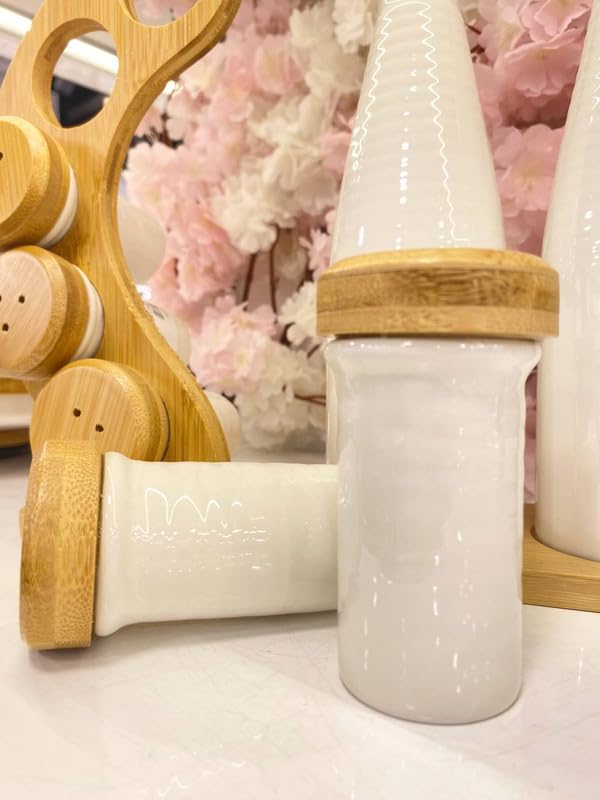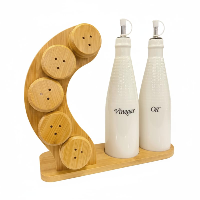 Generic - مجموعة زيت وتوابل من البورسلين، 7 قطع من زجاجات وخزازات سيراميك بيضاء مع حامل دوار من الخيزران، تتضمن زجاجتي زيت وخل و5 برطمانات توابل، منظم مطبخ عصري للطبخ وتناول الطعام